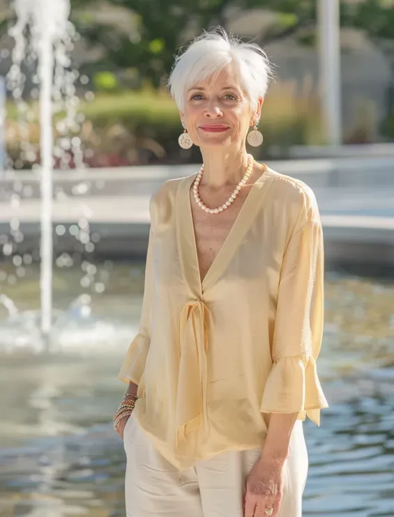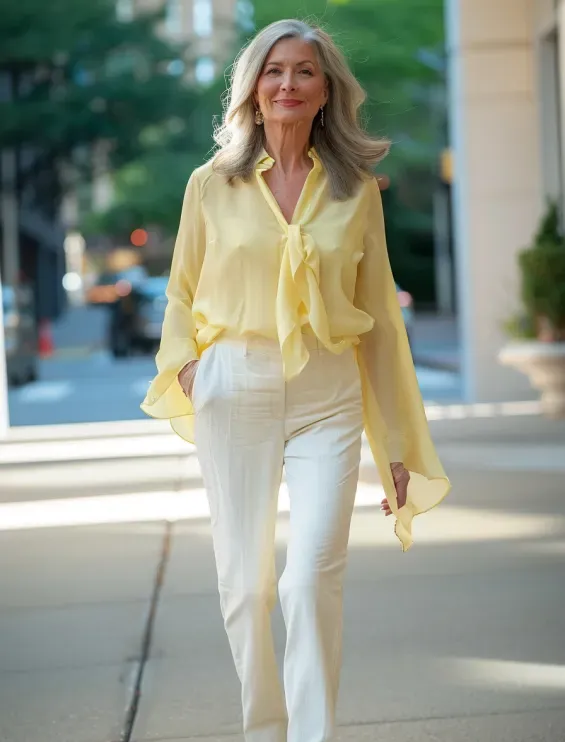 This outfit is all about light and movement. The flowy yellow blouse with a tie-neck detail adds a soft pop of color, balanced out by slim ivory trousers that bring the whole look together. Nude heels and simple earrings give it an elegant finish without distracting from the cheerful top.