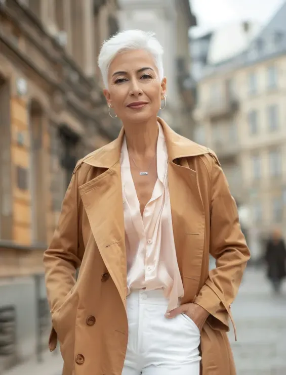 Here we have a silky blush blouse tucked into white trousers, topped off with a tan trench coat that adds instant polish. The soft satin contrasts perfectly with the structured coat, and the whole outfit looks so put-together with almost no effort.