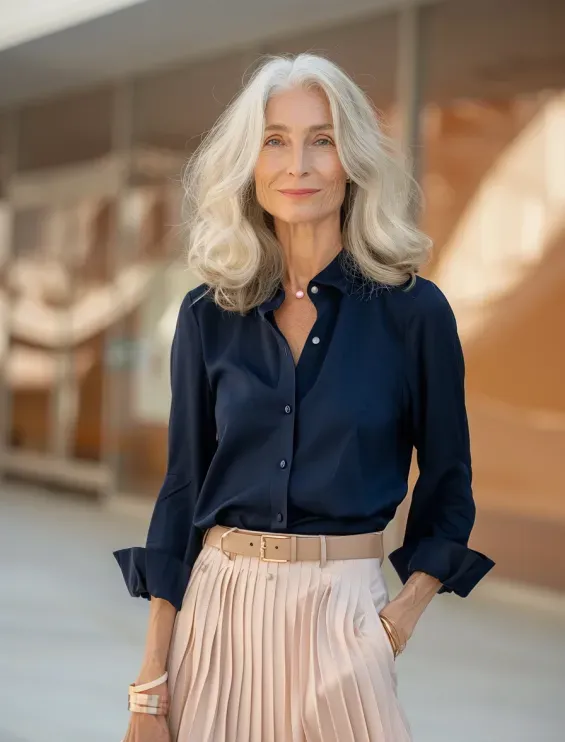 Here we ve got a classic navy button-down blouse paired with a flowing blush pink pleated skirt. The soft beige belt adds a bit of definition, and the accessories are kept simple and sleek. This combo brings contrast and movement while staying effortlessly stylish.