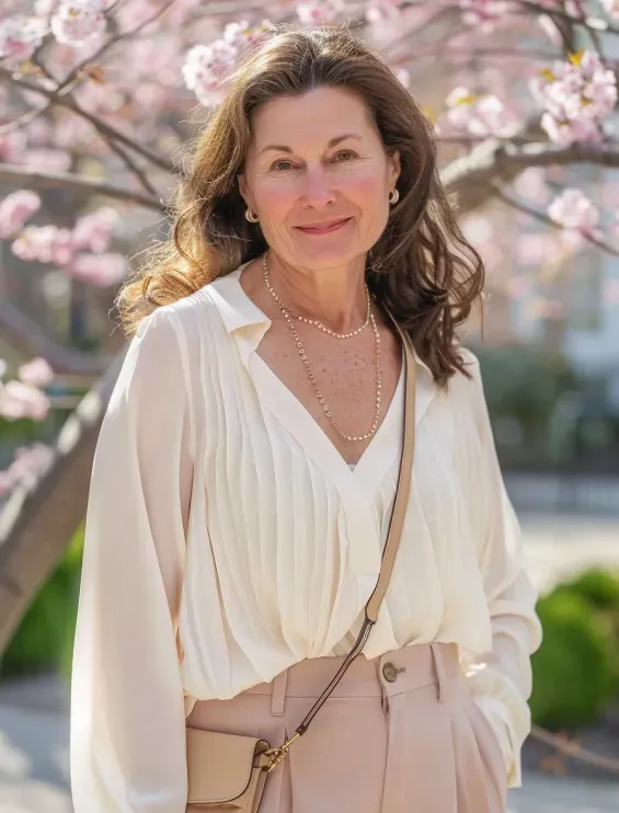 What I love about this outfit is how effortlessly polished it feels. The colors are gentle, yet sophisticated, and that blouse? It s giving grown-up glam in the best way. Perfect for a spring lunch date or an art gallery visit where you want to look graceful but still feel comfy.