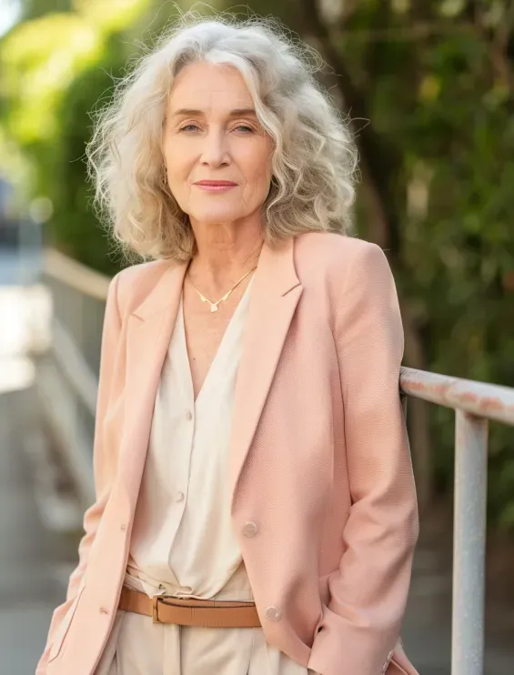 This outfit builds around a tailored blush blazer layered over a soft beige top and cream pleated trousers. The addition of a tan belt adds a little shape to the waist, while the mix of soft hues keeps everything looking light and sophisticated. A gold necklace finishes the look in a subtle way.