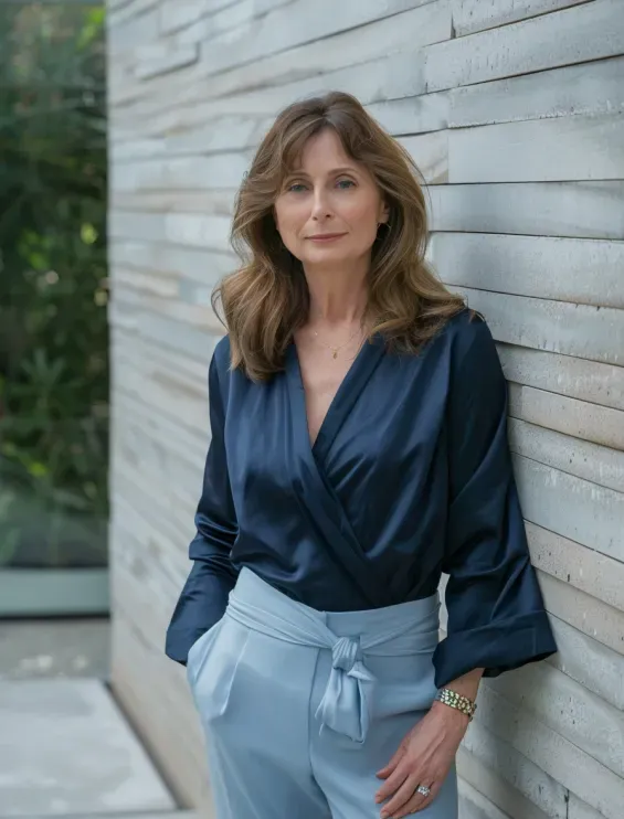 Here we ve got a deep navy satin wrap blouse paired with powder blue paperbag trousers that tie at the waist. The mix of textures gives the outfit depth, while the subtle monochrome color scheme keeps things sleek. A gold bracelet adds a hint of shine without being too much.