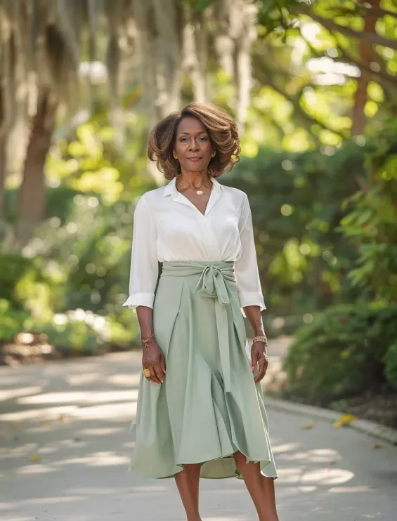 This outfit features a crisp white wrap blouse paired with a flowy mint green midi skirt that ties at the waist. The three-quarter sleeves and asymmetric hemline give the skirt beautiful movement. Nude heels elongate the legs, and gold accessories bring in a subtle shine.