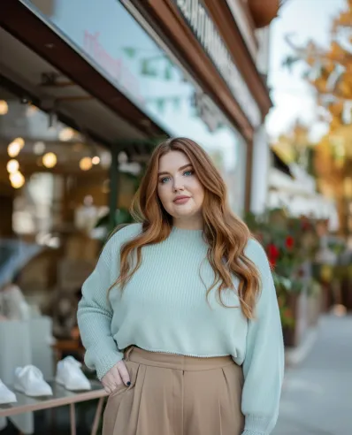This soft mint green sweater is perfect for those breezy spring days. Its relaxed fit and slightly cropped length complement the high-waisted, wide-leg tan pants beautifully. The combination of muted pastel and neutral tones feels both fresh and refined, making it ideal for a casual shopping day or a relaxed coffee date.