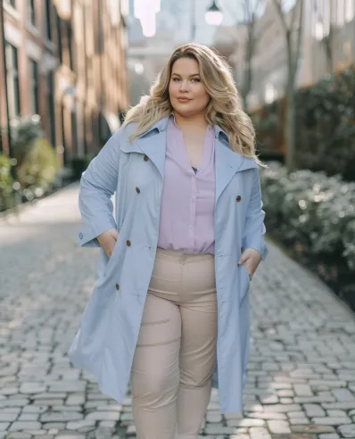 Light Blue Trench Coat with Lavender Blouse for Soft Spring Sophistication