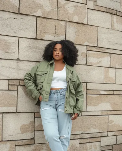 This outfit nails that laid-back, cool-girl aesthetic. The olive green utility jacket adds a touch of edge, while the white cropped tank keeps it fresh and simple. Distressed, light-wash jeans give a lived-in, carefree feel and pair perfectly with classic white sneakers for all-day comfort. It’s a go-to look for casual spring errands or outdoor hangouts.