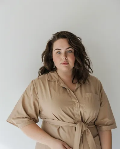 This beige shirt dress is the definition of easy, understated elegance. The classic button-down design, complete with a pointed collar and short sleeves, is elevated by the self-tie belt that beautifully defines the waist. The relaxed fit keeps it comfortable while still looking chic, making it a versatile option for both casual and semi-dressy occasions.
