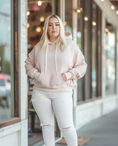 This casual spring outfit pairs a soft blush pink hoodie with white distressed skinny jeans, giving off a cozy yet stylish vibe. The oversized fit of the hoodie adds a relaxed charm, while the ripped jeans keep things fresh and a little edgy. White sneakers tie the look together for the perfect blend of comfort and street style.