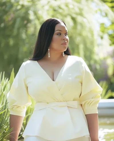 This sunshine-yellow peplum top is all about structured elegance. The wrap-style neckline draws attention upward, while the waist tie and flared peplum highlight your silhouette. Paired with fitted white pants, the combination feels polished yet breezy ideal for springtime brunches, outdoor gatherings, or even a relaxed day at the office. The addition of long pearl-drop earrings gives it a refined touch without being over the top.