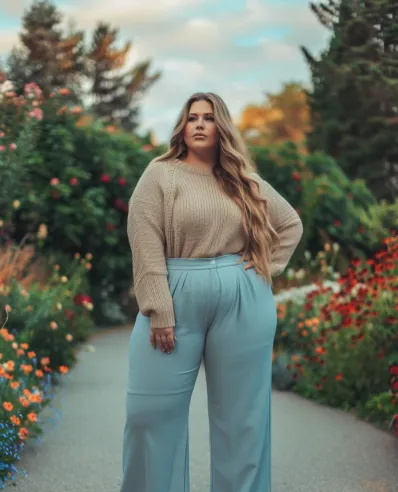 What I adore about this look is how effortlessly chic it feels! The soft beige and pastel blue palette create a calming, spring-appropriate aesthetic. The wide-leg trousers give you that elegant drape while keeping things comfortable. It s perfect for when you want to look polished but still feel as cozy as if you re wrapped in a favorite blanket.
