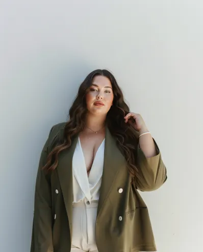 This olive green blazer adds a polished, tailored touch to an elegant cream ensemble. The draped blouse creates soft, flowing lines, while the wide-leg trousers elongate the silhouette for a graceful, statuesque effect. The double-breasted blazer adds structure and contrast, making it perfect for work meetings, classy brunches, or any occasion that calls for effortless sophistication.