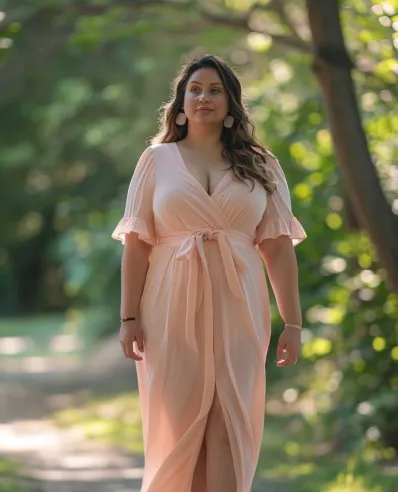 This soft, pastel pink wrap maxi dress with fluttery sleeves has a dreamy and romantic vibe. The flowy fabric drapes beautifully, cinched perfectly at the waist with a tie belt to accentuate your curves. Its subtle V-neckline and high leg slit add just a hint of flirtiness without being too revealing. Paired with comfy, low sandals and statement earrings, this outfit strikes the perfect balance between elegant and effortless.