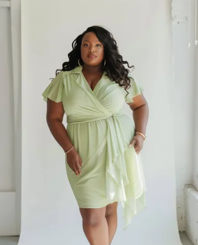This dreamy light green wrap dress is all about feminine elegance. The flutter sleeves and cascading ruffled hem add beautiful movement, while the wrap design cinches the waist to create a flattering silhouette. The soft pastel shade feels perfect for spring, and neutral heels complete the look with a polished touch. Ideal for weddings, brunches, or springtime celebrations!