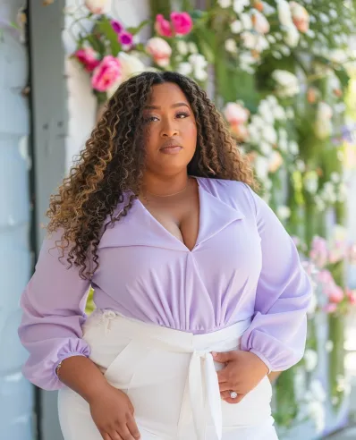 This flowy lavender blouse is pure spring perfection, featuring subtle gathers and a flattering V-neckline. The airy sleeves add softness and movement, while high-waisted white pants with a tie belt cinch the waist beautifully. The contrast of soft lavender and crisp white feels bright and fresh, perfect for a garden party or lunch date.
