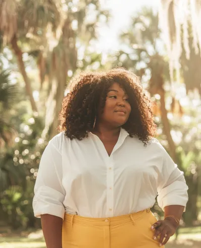 This look pairs a classic white button-down shirt with vibrant yellow trousers that instantly brighten up any spring day. The relaxed fit of the shirt balances perfectly with the tailored high-waisted pants, creating a polished yet comfortable silhouette. The bold color choice feels playful and fresh, making it perfect for outdoor events or weekend outings.