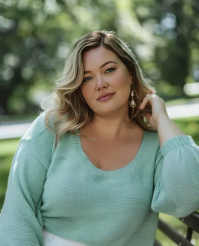 This light and airy outfit pairs a soft mint green sweater with breezy, high-waisted white pants. The sweater s relaxed fit and gentle V-neckline keep things cozy, while the wide-leg pants add an elegant, flowy touch. Statement earrings finish off the look, making it perfect for a picnic or a peaceful park stroll on a sunny spring afternoon.