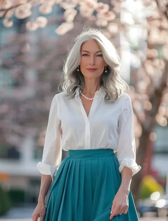 This elegant look features a crisp white button-up shirt tucked into a flowing teal pleated midi skirt. The top has a classic collar and rolled sleeves for a relaxed polish, while the skirt adds movement and a lovely pop of rich color. A pearl necklace and drop earrings complete the outfit with timeless charm.