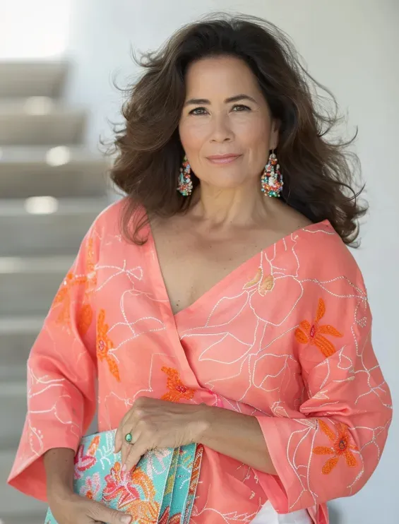 This bright coral blouse brings serious spring energy with its floral embroidery and airy, wrap-style design. The lightweight fabric and wide sleeves give it a relaxed fit, while the detailed stitching adds texture and personality. Paired with a colorful clutch and bold earrings, the whole outfit feels cheerful and completely unique.
