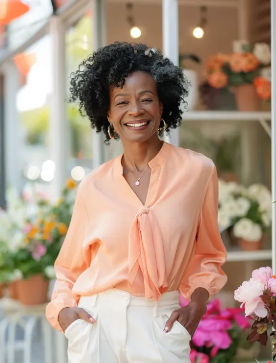 This outfit pairs a silky peach blouse with high-waisted ivory trousers for a soft, elegant look that feels perfect for spring. The blouse has a lovely tie detail at the neckline, adding a little bit of drama without going overboard. Light pleats on the pants keep the silhouette clean, while the fabric flows just enough to feel easy.