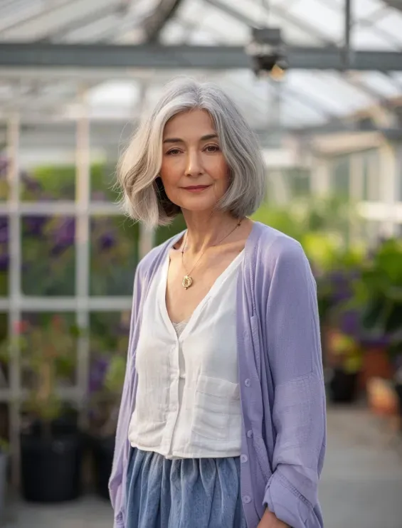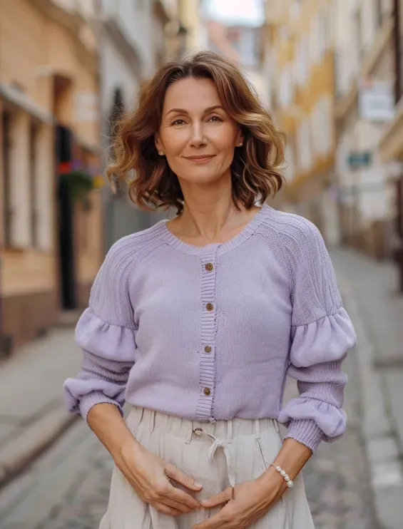 This soft, romantic look features a flowy lavender cardigan layered over a simple white buttoned blouse. The airy fabrics make everything feel relaxed and breathable. A gathered denim blue skirt adds texture and fullness, creating a gentle contrast that s still totally harmonious. A delicate gold pendant adds just the right touch of charm.