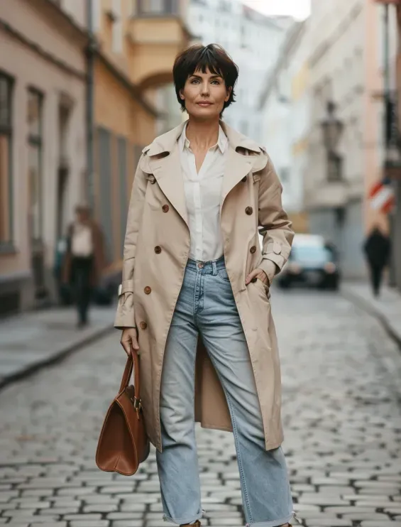 This outfit pairs a timeless beige trench coat with a crisp white blouse and relaxed light-wash jeans. The coat’s structure brings a polished edge while the rolled cuffs on the jeans keep things laid-back. Brown ankle boots and a matching structured handbag add just the right amount of warmth and coordination to the whole look.
