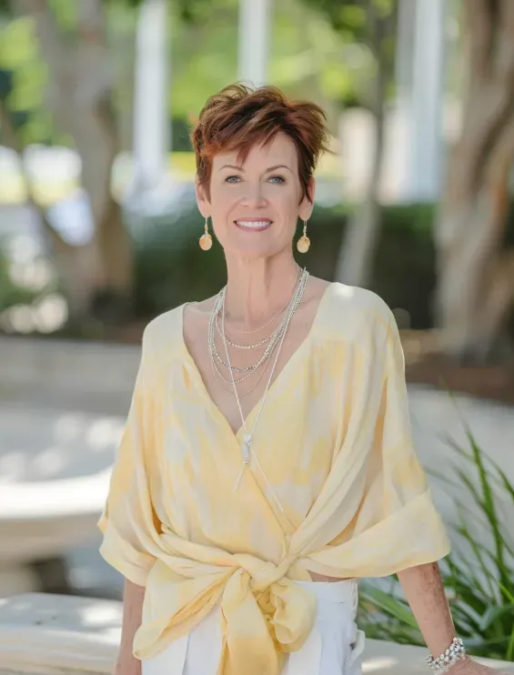 This cheerful look features a soft yellow blouse with a relaxed fit and a front tie that adds a playful touch. The breezy fabric and subtle pattern make it feel perfect for warm spring days, while the deep V-neck shows off layered silver necklaces beautifully. Paired with crisp white trousers and light jewelry, the whole vibe is bright and breezy.