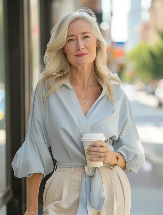 This elegant look combines a soft light blue wrap blouse with wide, cuffed sleeves and a matching tie at the waist. The blouse pairs beautifully with high-rise cream trousers featuring pleated details for a flattering, elongated silhouette. A delicate necklace and simple bracelet finish it all off with just the right amount of sparkle.