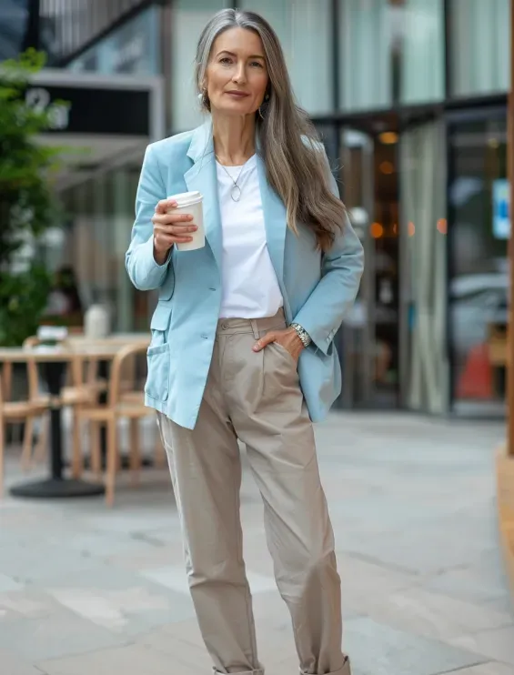 This outfit is an easygoing blend of comfort and polish. The soft blue blazer adds a splash of color over a crisp white tee, while the cuffed beige trousers bring a laid-back charm. Paired with classic white sneakers and simple jewelry, it strikes a balance between casual and pulled-together that just works.