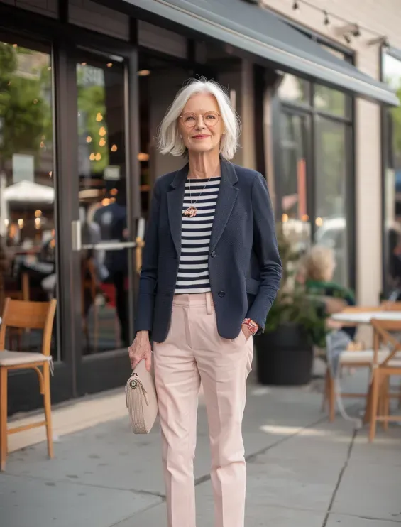 I really adore how balanced this outfit feels. It s sharp without being stuffy, and those blush pants? They soften the whole look in the loveliest way. The stripes give it a cool, timeless vibe and the sneakers just seal the deal for me. It s the kind of outfit that feels like it belongs in a little Parisian café yes please.