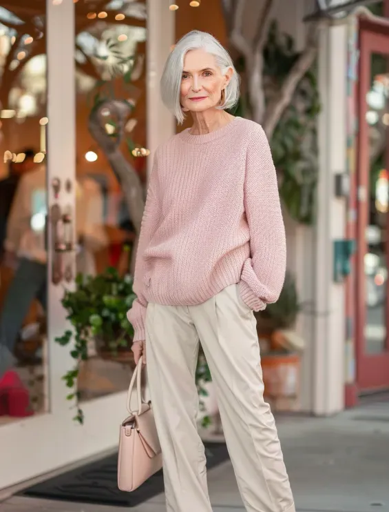 This outfit leans into soft tones with a blush pink knit sweater, paired effortlessly with slim cream trousers. The look is pulled together with matching blush sneakers and a structured handbag in a similar hue. The relaxed fit of the sweater and the rolled hems of the pants make the whole thing feel comfy but still thoughtful.