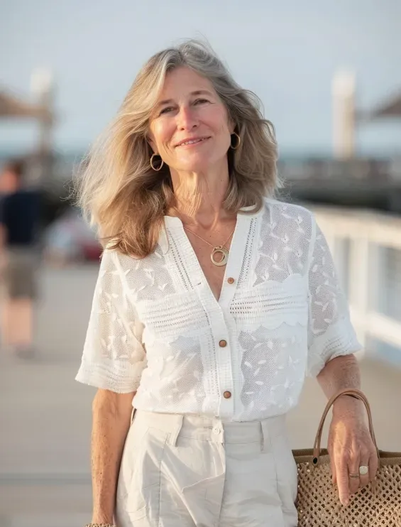 I m absolutely loving how coastal and carefree this look feels. It s simple, but there s so much charm in the texture and the little details. The blouse is lightweight but still elegant, and the whole outfit makes me think of strolls by the water or a peaceful afternoon at a cafe. It s that kind of easy outfit that somehow always looks amazing.