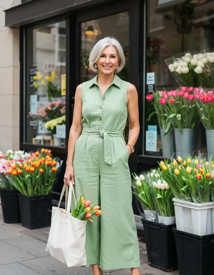 This sage green jumpsuit is springtime perfection. With a sleeveless button-up top, flattering tie waist, and wide cropped legs, it s airy, effortless, and oh-so-lovely. The soft linen-like fabric gives it that casual, breathable vibe perfect for a stroll through the flower stalls. Finished off with strappy nude sandals, pearl earrings, and a tote full of tulips, this look is everything charming and cheerful.