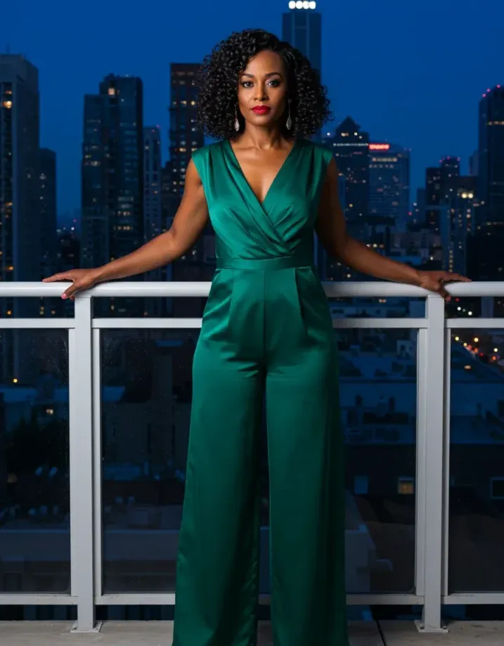 This emerald green jumpsuit is a total showstopper. Made from a silky, drapey fabric that catches the light beautifully, it features a wrap-style bodice that flatters the neckline and a wide-leg silhouette that flows like a dream. The sleeveless cut keeps things sleek and elegant, while those sparkling earrings and strappy heels make the whole look feel ready for a rooftop soirée.
