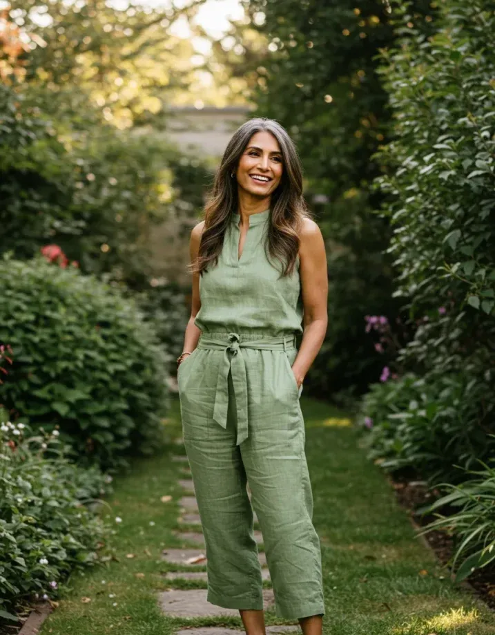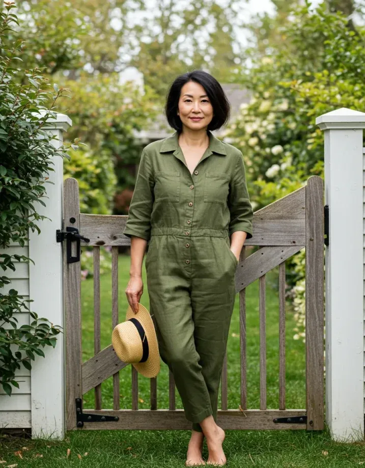 This olive green jumpsuit is everything you want on a relaxed day. The breathable fabric, soft button-front, and slightly cropped sleeves make it feel super easy and wearable. The fit is comfy but still has structure thanks to that cinched waist and flattering collar. She s barefoot and holding a straw hat total garden goddess energy without even trying.