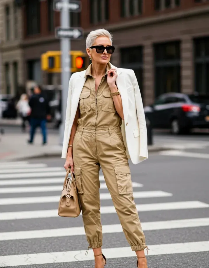 This khaki utility jumpsuit is giving boss-level street style. It s got all the details zip front, flap pockets, and elasticized ankle cuffs that make it edgy and functional. But then she throws a crisp white blazer over the shoulders, and boom, the whole look transforms into power-luxe. With nude heels, a structured handbag, and bold sunnies, this outfit is ready to own any crosswalk like a runway.