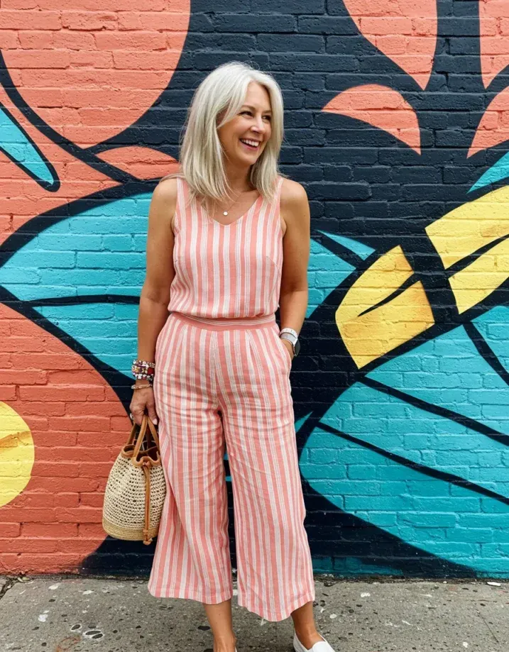 This coral and white striped jumpsuit is basically sunshine in outfit form. With a sleeveless cut and cropped wide legs, it s light, breezy, and made for warm weather adventures. The vertical stripes are super flattering, and the soft fabric gives it that effortless, throw-it-on-and-go feel. Paired with white slip-on sneakers, a woven bucket bag, and colorful bracelets, it s giving full-on fun without trying too hard.
