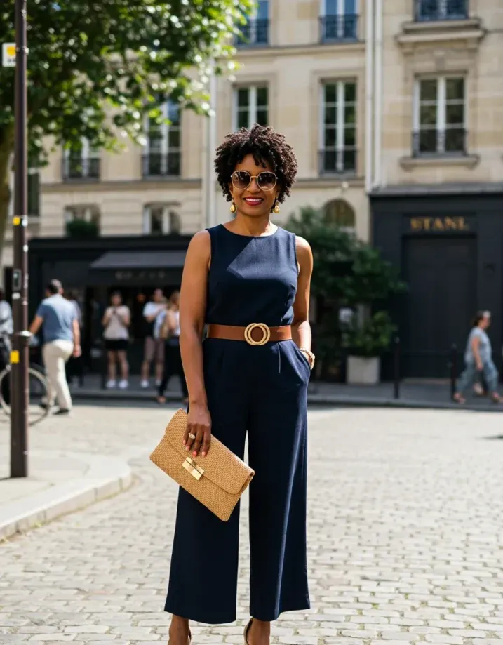 This navy sleeveless jumpsuit is all about effortless elegance. The clean lines and wide-leg cut make it super flattering, while the structured brown belt adds a bold, waist-defining touch. Paired with neutral wedge heels, a textured clutch, and oversized round sunglasses, the look feels polished, timeless, and très chic.