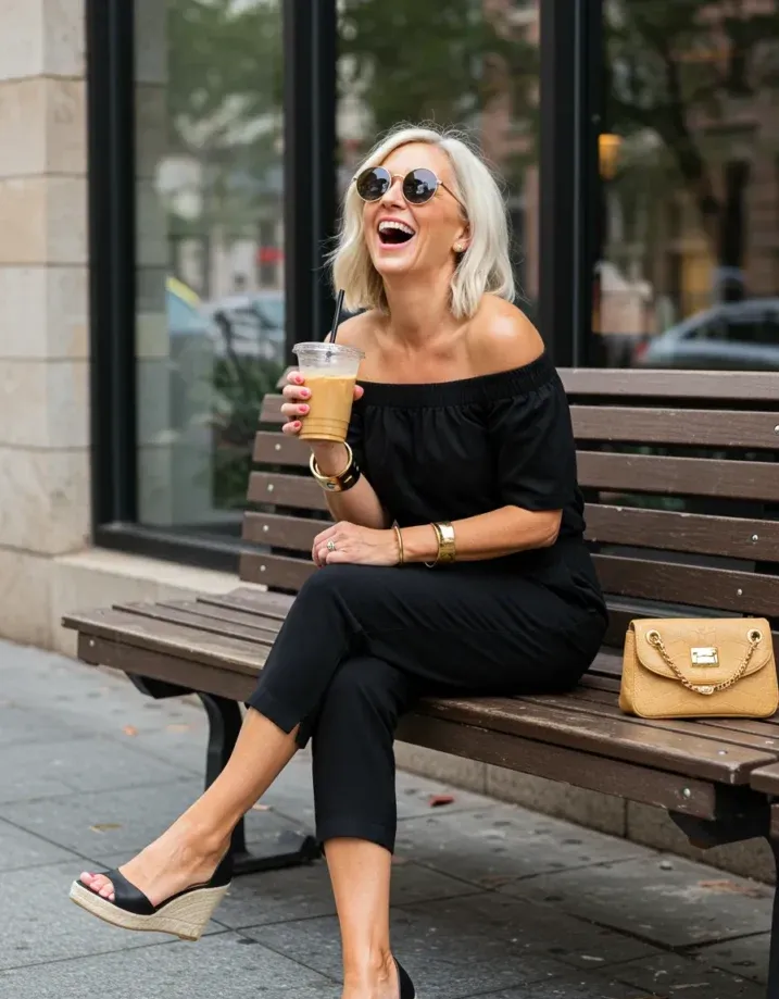 This black off-shoulder jumpsuit is giving carefree glam in the best way possible. The neckline is wide and feminine, showing off the shoulders just enough, while the cropped pants and lightweight fabric keep it fun and breezy. Paired with black wedge espadrilles, bold bangles, and round sunnies, the whole outfit feels like iced coffee on a sunny patio kind of energy.