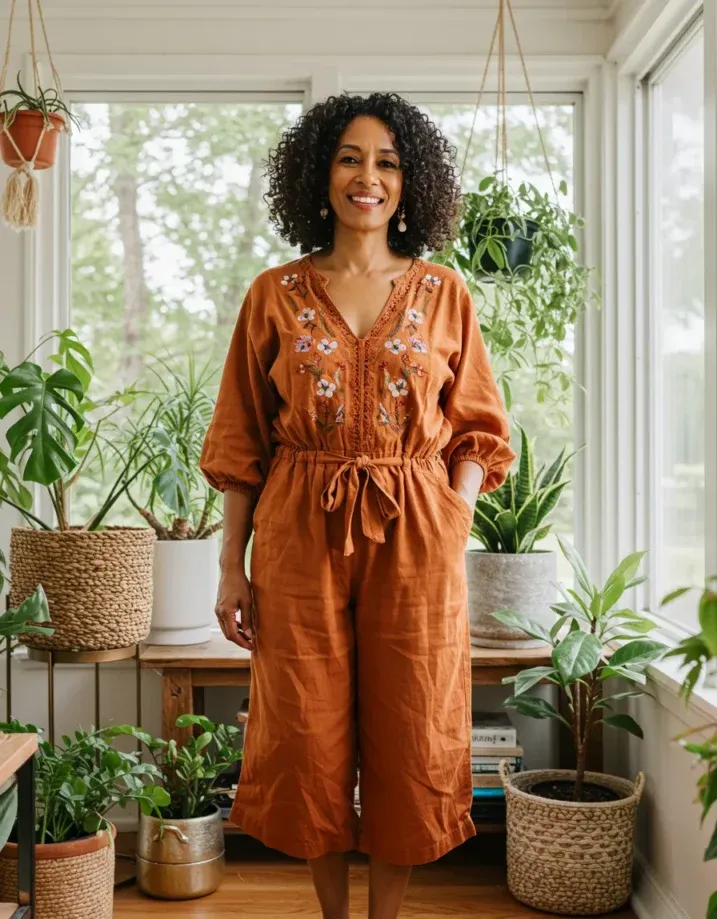 This terracotta jumpsuit is a little slice of boho heaven. With soft, flowy fabric and intricate floral embroidery on the chest, it has that cozy artisanal vibe that feels right at home in a sun-drenched plant-filled space. The three-quarter sleeves add warmth, and the tie waist pulls everything together in the most flattering way. The cropped wide legs give it that relaxed silhouette, and honestly, it looks just as good barefoot as it would with sandals.