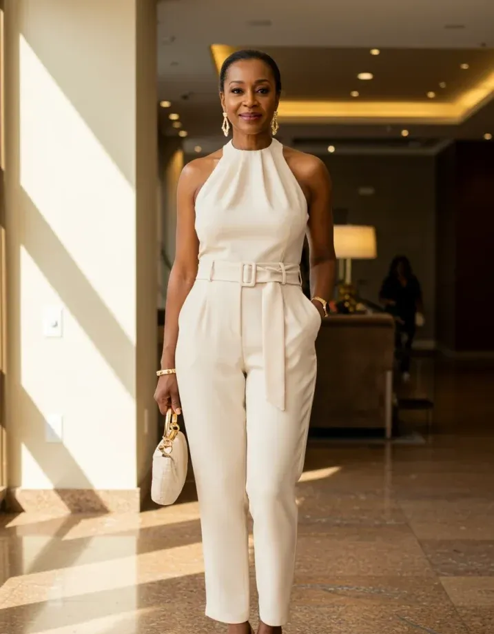 This cream jumpsuit is pure class in one piece. The high halter neckline and tailored bodice give it a red-carpet feel, while the belted waist cinches just right to show off your shape. The slim ankle-length cut keeps things modern, and the soft neutral tone is seriously versatile. Finished with pointed heels, a structured clutch, and gold jewelry, it s a whole vibe of graceful confidence.