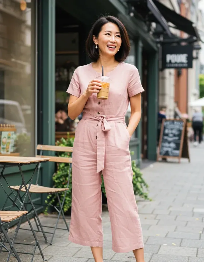 This blush pink jumpsuit is what weekend dreams are made of. The linen fabric keeps it light and breezy, while the short sleeves and wide cropped legs give it that easygoing feel. The waist tie adds a bit of shape without being fussy, and the wooden buttons running down the front are just the cutest little touch. Paired with simple slip-on shoes and a bright smile, it s casual-cute perfection.