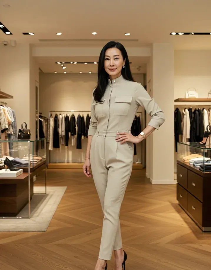 This tailored beige jumpsuit is the definition of sleek and structured. The high collar, crisp chest pockets, and slim-cut legs give it that clean, powerful silhouette that means business in the most fashionable way possible. The 3/4 sleeves and fitted waist pull everything together, and those black heels? Instant polish. It s modern, minimal, and totally refined.