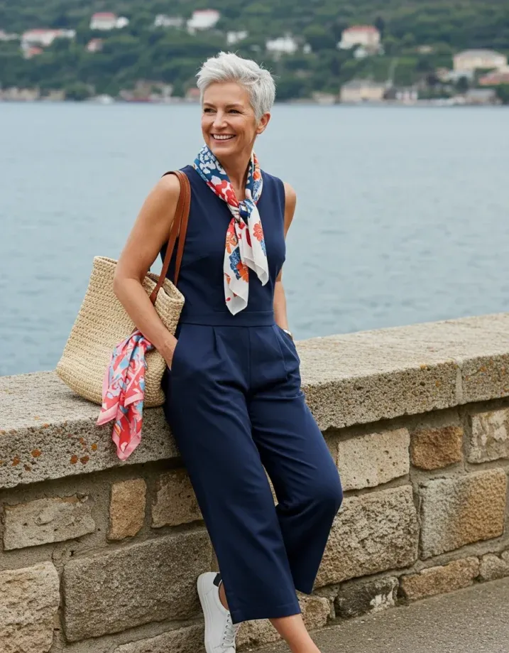 This navy sleeveless jumpsuit is the kind of classic that never quits. The clean lines and cropped length make it feel fresh and modern, while the pleated waist adds a gentle, flattering shape. What really pulls it all together is that colorful scarf tied at the neck bright, playful, and totally charming. Paired with crisp white sneakers and a straw tote, it’s giving vacation-ready with a hint of Parisian flair.