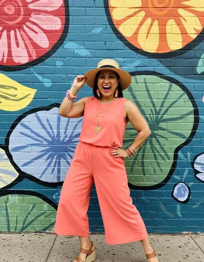 This bright coral jumpsuit is pure sunshine in outfit form. With a sleeveless cut and a comfy elastic waist, it s relaxed and playful all at once. The wide cropped legs make it easy to move in, and the bold color is the kind that turns heads in the happiest way. Accessorized with chunky bracelets, a straw hat, statement earrings, and fun wedges, this look is bursting with personality.