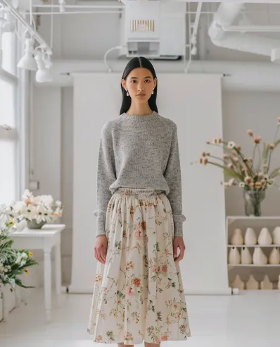 This outfit blends comfort and grace perfectly. A soft gray knit sweater, with its relaxed yet tailored fit, pairs beautifully with a flowing midi skirt. The skirt showcases a delicate floral pattern with soft pastels, giving off fresh spring vibes without being overpowering. Nude open-toe heels keep the look light and feminine, perfect for a chilly day where you want a hint of warmth and elegance.