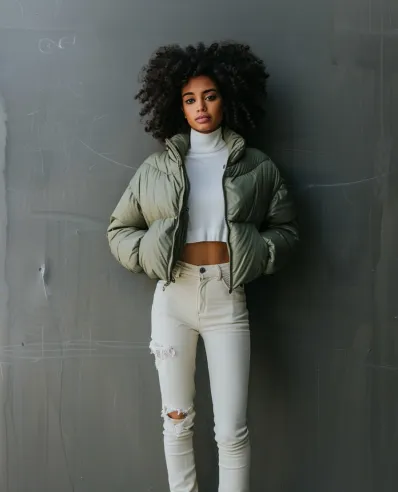 This outfit nails the street-chic aesthetic. A cropped olive puffer jacket keeps things warm without sacrificing style, while a sleek white turtleneck adds a clean and polished base. The high-rise, off-white distressed jeans bring a touch of edge, and the neutral ankle boots tie the look together perfectly with just the right amount of attitude.