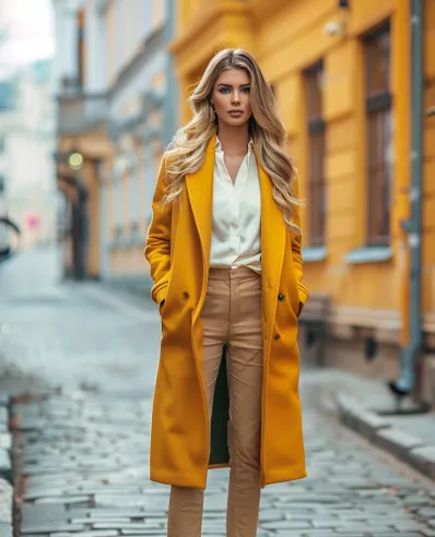 This outfit is a stunning blend of bold and classic. The bright mustard-yellow coat immediately grabs attention, creating a warm, cheerful vibe. Underneath, a crisp white blouse and beige tailored trousers provide a clean, elegant foundation. Nude pumps complete the look, elongating the silhouette while letting the coat remain the star of the show.