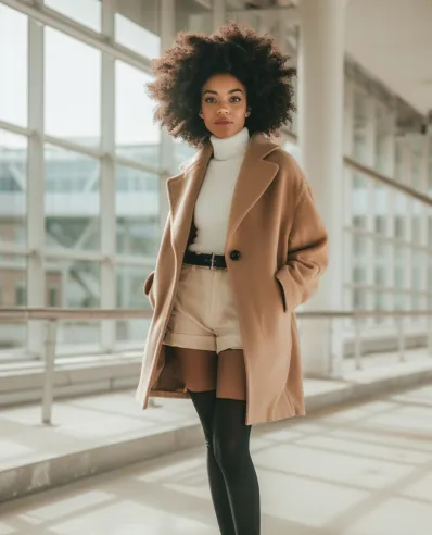 This outfit is all about playful contrasts and clever layering. A warm camel coat adds structure and warmth, while the white turtleneck offers a clean, sophisticated base. High-waisted beige shorts paired with black tights bring a fun and trendy twist. To finish the look, ankle boots and a black belt tie everything together with a sleek touch.