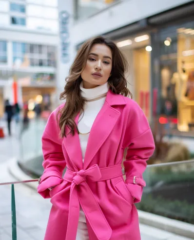 This outfit is bold, bright, and perfect for spring! The eye-catching pink belted coat instantly adds energy and flair. Underneath, a white turtleneck and wide-leg white trousers create a fresh, sophisticated base. The contrast between the vibrant coat and neutral layers is striking, ensuring you stand out in any crowd.