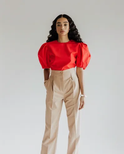 This outfit is a perfect balance of bold and classic. The bright red blouse with voluminous puff sleeves adds drama and personality, while the high-waisted beige trousers provide a clean and structured contrast. White sneakers keep the look grounded and effortlessly cool, making it great for both casual and semi-dressy occasions.